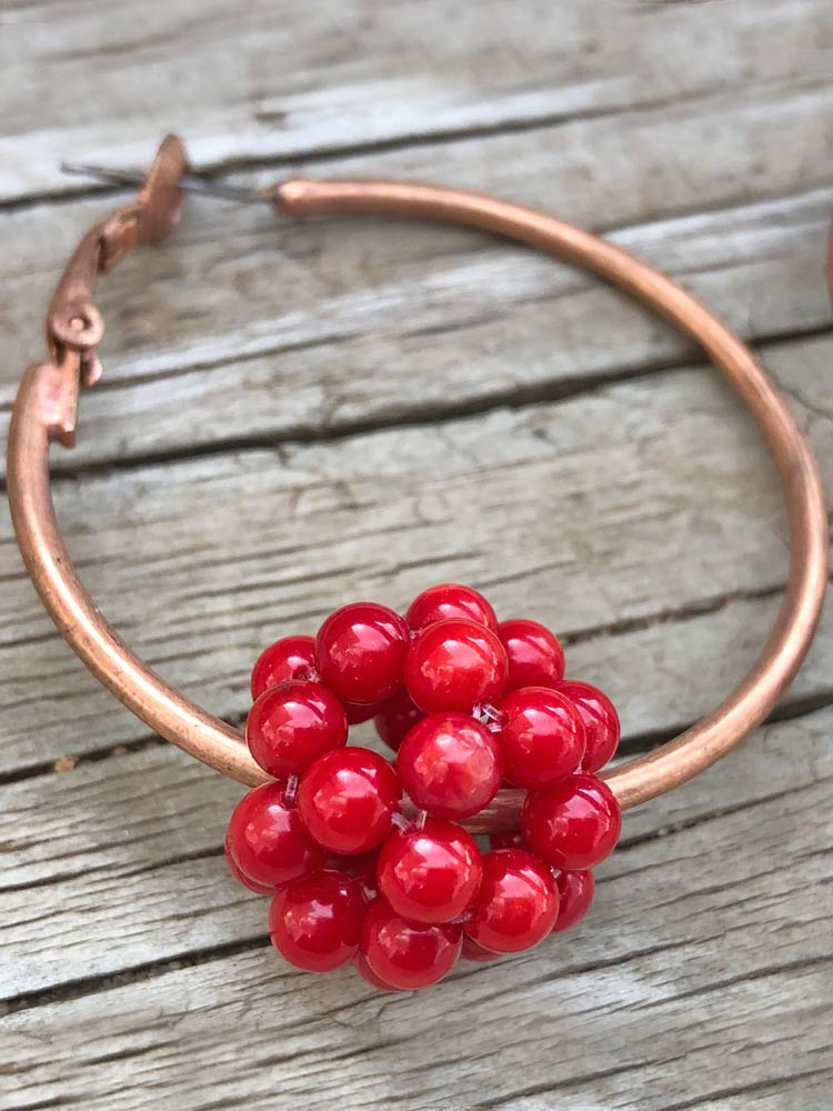 Boho Chic Copper Large Hoop Italian Red Coral Cluster Earrings. Made from the finest hand-chosen materials. I vigorously source out all parts of every detail that goes into my creations. My love affair for gemstones started many moons ago. I adore all shapes, colors, and sizes. Mixing and combing is what I do. Mother Nature gives us these treasures and every stone has a spiritual and healing value. Besides, the visual satisfaction gemstones provide, you are able to heal and prosper in a stylish way. Item # vje0011
